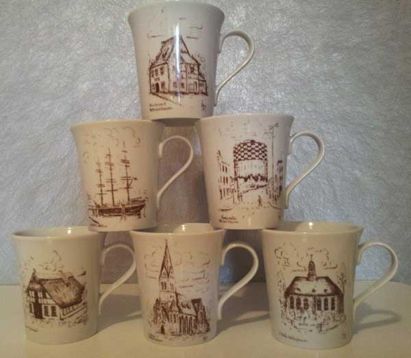 Die schon bekannten Motive Schulschiff Deutschland, Storchennest, Gasometer, die Kirchen Rablinghausen und Woltmershausen und das Bauer Jansen Haus, werden um ein Motiv erweitert. Das Polizeirevier Woltmershausen. 7 Becher in einem stabilen Karton kosten 30 Euro.