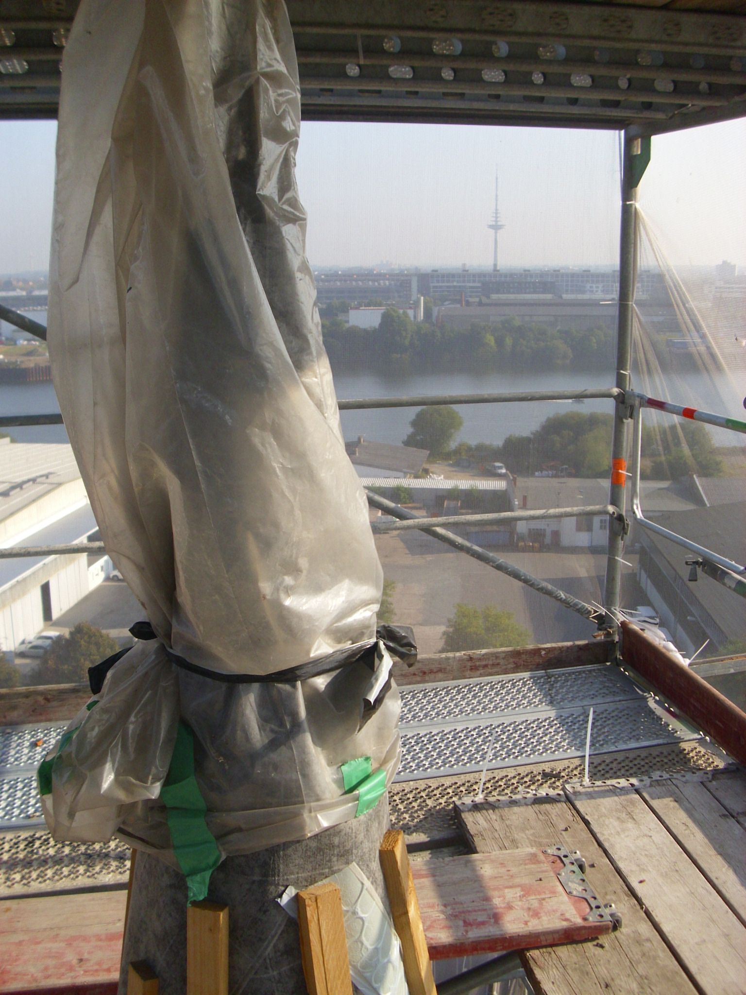 Noch bis in den Dezember hinein wird am Turm der Christuskirche in Woltmershausen gearbeitet, um dessen Dach zu erneuern und Reparaturen am Mauerwerk vorzunehmen. Zwei Gemeindeglieder, Liane Peters und der Künstler Joachim „Bommel“ Fischer, durften mit einer Sondergenehmigung den Turm besteigen. Dabei machten sie viele Fotos, von denen gut dreißig Stück im Schaufenster von Fischers Schauraum an der Straßenecke Auf dem Bohnenkamp / Stuhrer Straße ausgestellt sind. Die kleine Präsentation zeigt Blicke aus 44 Metern Höhe über den Stadtteil und Details des Turms und der Anbringung des Kupferdaches. Die Glocken und die Kirchturmspitze, die wirken, als seien sie vom Verpackungskünstler Christo verhüllt worden, sind ebenso zu sehen wie Einblicke in das Gerüst, das den Turm umgibt, sowie kleine Stillleben. Die Ausstellung kann bis zum ersten Advent am besten bei Tageslicht angeschaut werden.